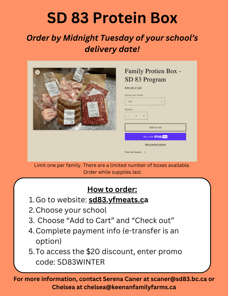 SD83 families are invited to take part in the Farmer’s Choice Box Program. To order a veggie box please click here and to order a protein box please click here.